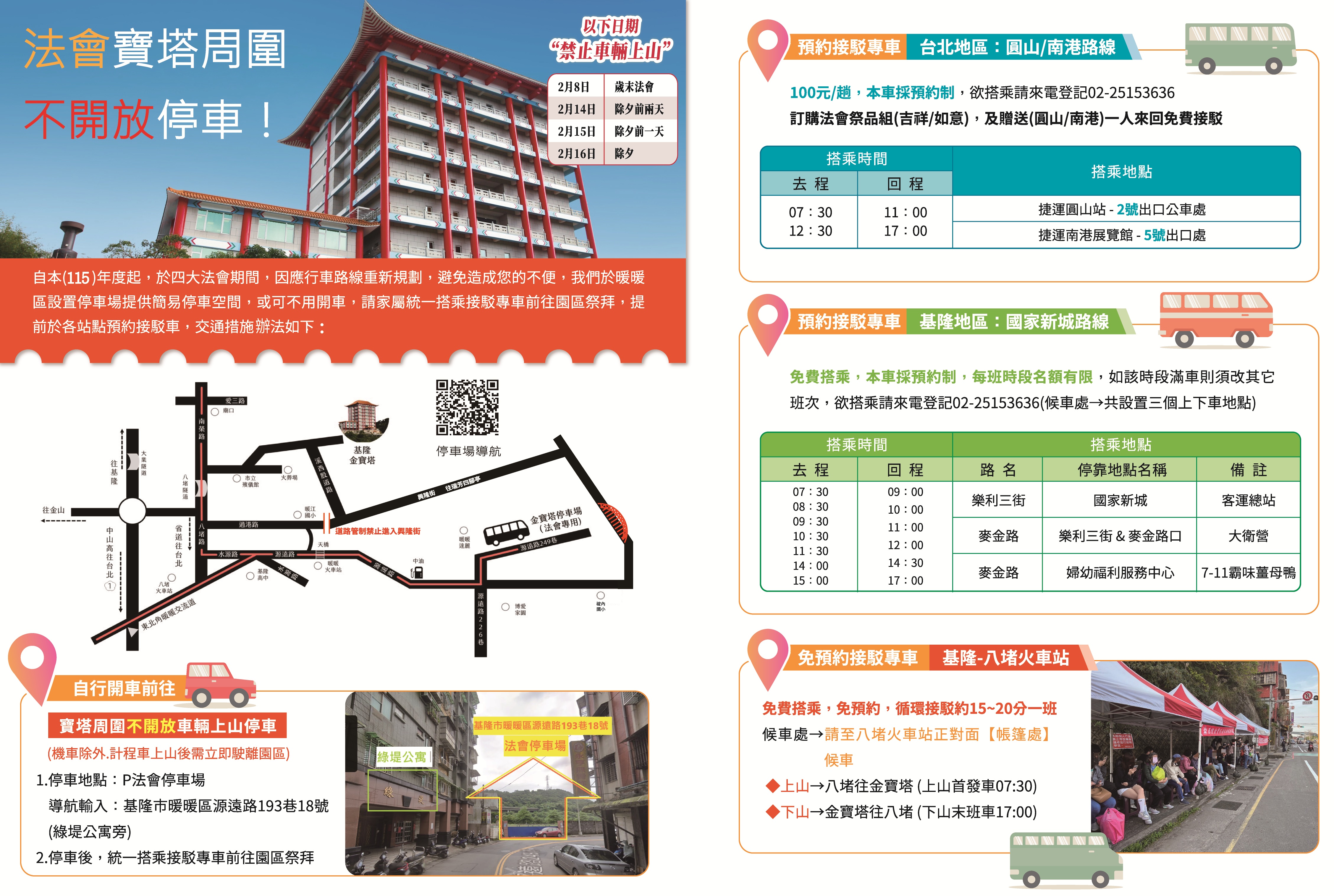 開車注意!從115年開始寶塔四大法會期間,2/14~2/16農曆年前,自行開車民眾停車改在山下暖暖停車場,再搭接駁車上山,詳細請看公告。